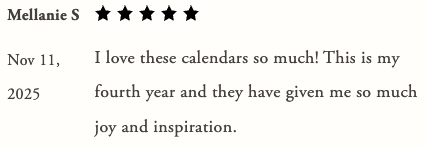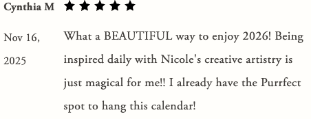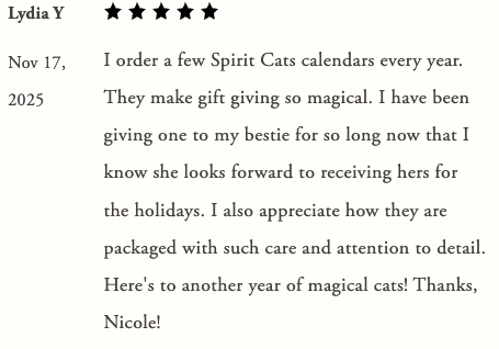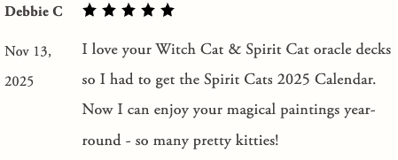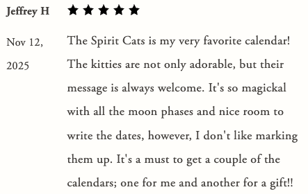Thank you all so much for the 5-star reviews that have been pouring for my 2026 Spirit Cats Calendar! My heart is aglow!Here's a taste of what you have all been saying πβ So much more than your typical mass-produced calendarARTIST MADE MAGICAL TOOL LOCALLY MADE Each calendar comes lovingly packaged in a protective, clear cello sleeve with mini art print included ~ shipped in a sturdy cardboard box so the calendar will arrive to you in pristine condition.